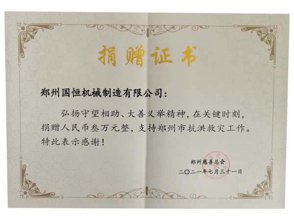 一場千年一遇的大雨,造成整個城市排水系統癱瘓,因暴雨導致的洪水,造成多地受災嚴重,有人甚至因此失去了生命,為了支援災后重建,鄭州國恒機械設備制造有限公司,捐款叁萬元整,支持鄭州市抗洪救災工作,愿我們守望相助,共渡難關。